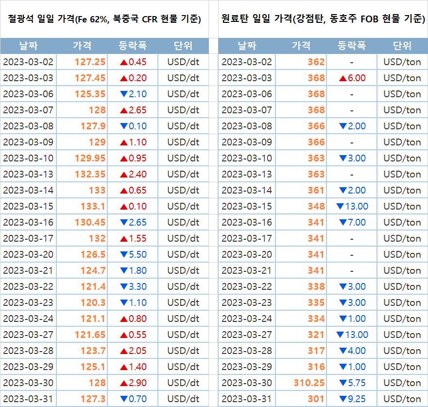[표]일일 철강 원료 가격 동향(3월 31일)