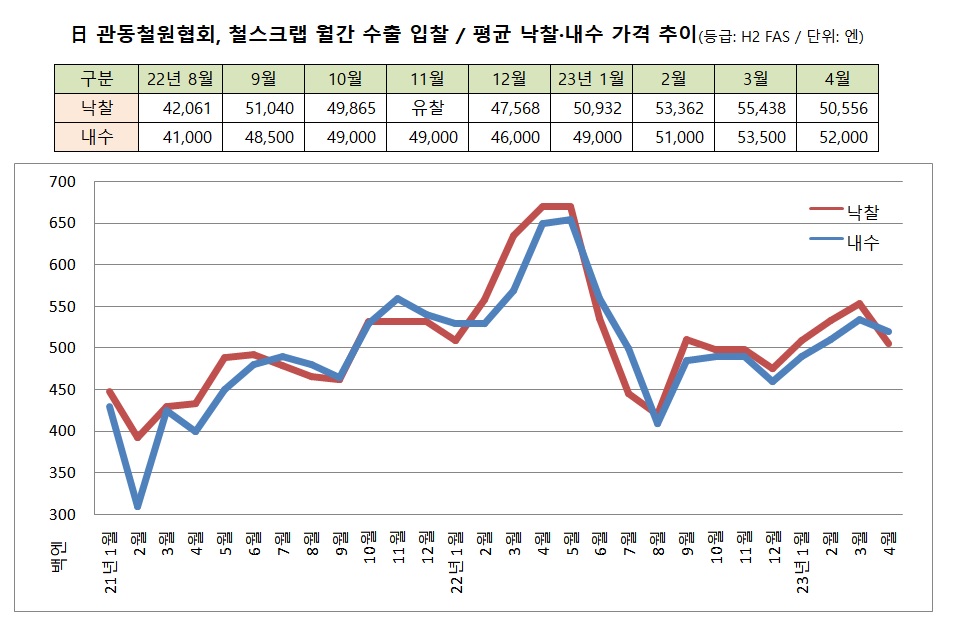 업계에 따르면 11일 관동철원협회가 진행한 철스크랩 수출 입찰에서 H2 낙찰 가격은 톤당 5만556엔(FAS)으로 전월(5만5,438엔) 대비 4,882엔 하락했다. FOB 기준 약 5만1,500엔으로 평가된다.