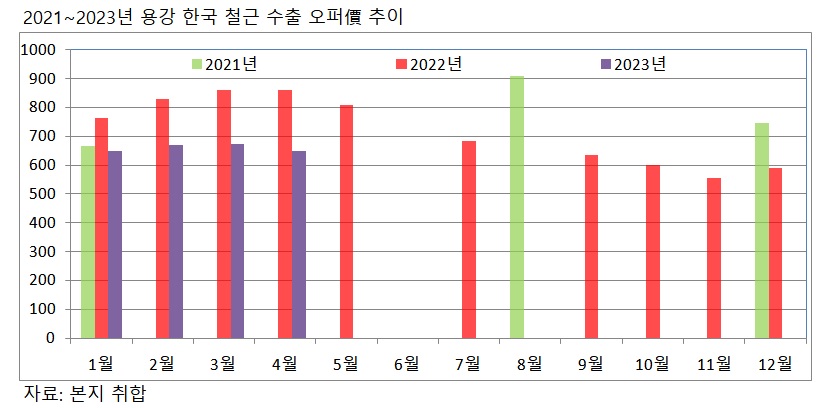 용강강철의 3월 최초 오퍼 가격은 톤당 675달러(CFR, SD400 10mm)로 4개월 연속 상승한 바 있다. 최종 성약가격은 톤당 663달러였다.