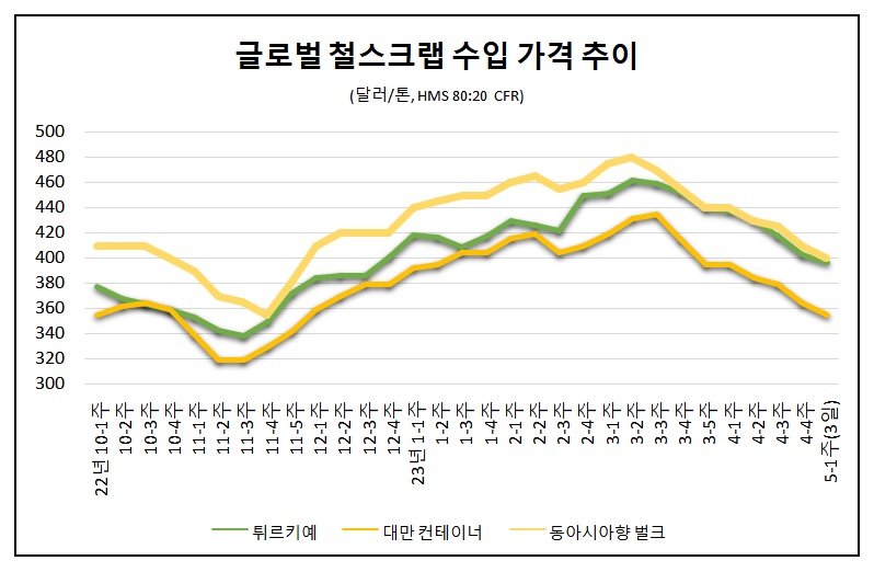 업계에 따르면 5월 첫째 주(3일) 튀르키예 철스크랩 수입 가격은 미국산 HMS(80:20) 기준 톤당 397달러(이하 CFR)로 전주 대비 6달러 떨어지면서 8주 연속 하락했다.
