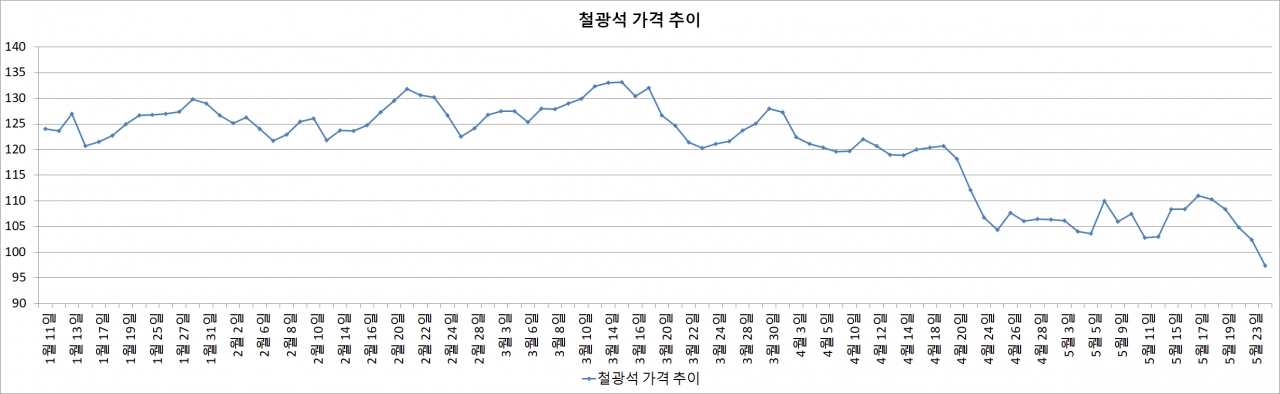 산업통상자원부에 따르면 24일(현지 시간) 기준 철광석 가격은 톤당 97.35달러를 기록했다. 이는 전일 대비 5.05달러, 전주 대비 11.05달러 하락한 가격이다. 연초 대비로는 20.3달러 하락했다.