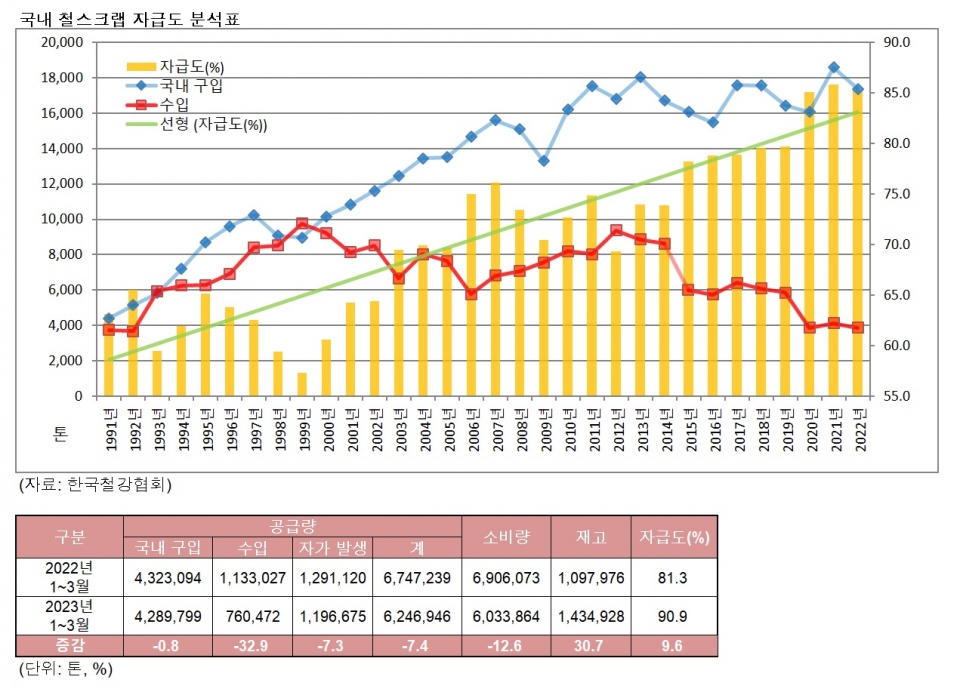 한국철강협회 자료에 따르면 올해 1분기(1~3월) 국내 철스크랩 자급률은 90.9%로 전년 동기(81.3%) 대비 9.6% 포인트(p) 상승했다.