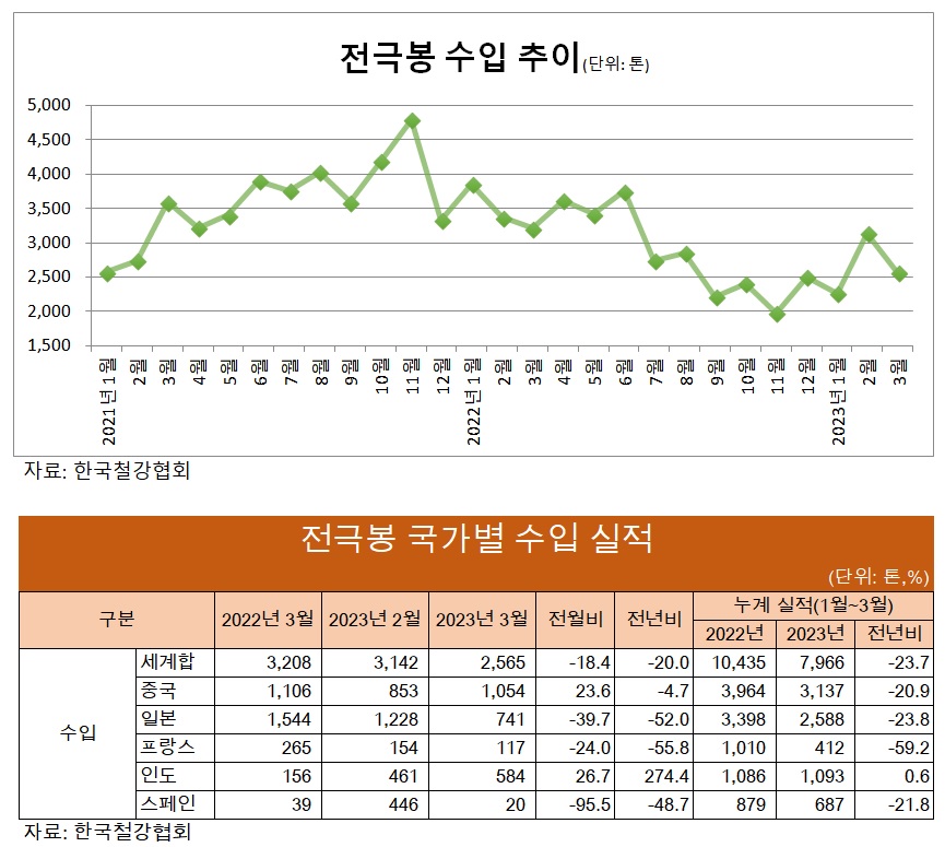 전기로 부원료로 사용되는 전극봉 수입도 올해 1분기 7,966톤으로 전년 동기 대비 23.7% 감소했다.