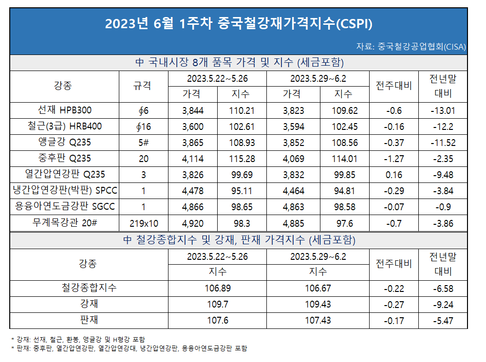 관련기사 [표] 2023년 5월 4주차 중국철강재가격지수(CSPI) [표] 2023년 5월 3주차 중국철강재가격지수(CSPI) [표] 2023년 5월 2주차 중국철강재가격지수(CSPI) [표] 2023년 5월 1주차 중국철강재가격지수(CSPI) [표] 2023년 4월 4주차 중국철강재가격지수(CSPI) [표] 2023년 4월 3주차 중국철강재가격지수(CSPI) "中 철강재 가격 반등 빨라야 연말" 번시강철, 6월 한국향 냉연판재류 수출價 공개 [표] 2023년 6월 2주차 중국철강재가격지수(CSPI) [표] 2023년 6월 3주차 중국철강재가격지수(CSPI)