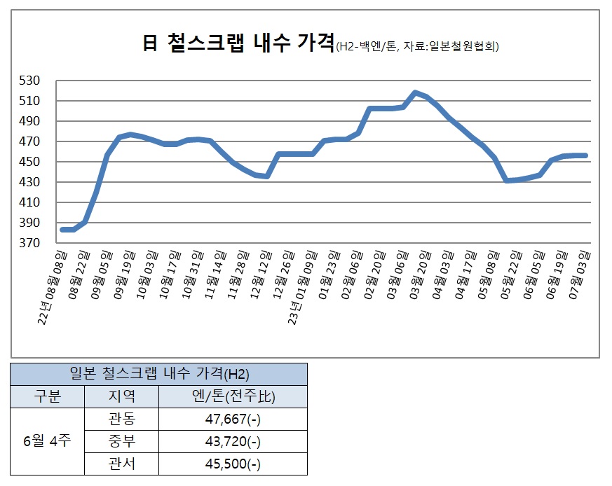 일본철원협회에 따르면 6월 넷째 주(26~30일) 관동, 중부, 관서 지역에서 H2 등급 철스크랩 가격은 평균 톤당 4만5,629엔으로 전주 대비 보합을 나타냈다.