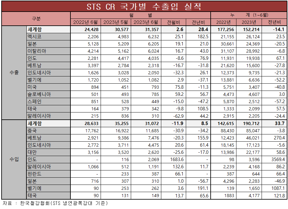 올해 상반기 STS CR 수입량 전년 동기比 34% 증가...베트남산 ‘폭증’