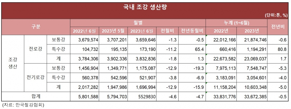 한국철강협회에 따르면 2023년 1~6월 국내 조강 생산량은 3,367만2천톤으로 지난해 같은 기간의 3,383만1천톤 대비 0.5%가 감소하면서 1분기의 5.3%, 1~4월의 4.3%, 1~5월의 3.7% 감소 대비 감소 폭을 줄이기는 했지만, 여전히 감소를 면하지는 못했다.