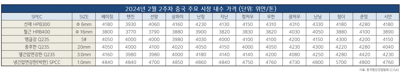 관련기사 [표] 2월 2주차 중국철강재지수(CSPI) 명절 전 수요 감소 영향…中 판재류 오퍼價↓ 금형조합, ‘2024 중국 상하이 금형전시회’ 한국관 신청 접수 구조관 업계, 중국산 HR 매입 확대하나? (컬러강판) 잊을만하면... 중국 수입, 1.5만톤선 붕괴 (후판) 중국산 후판, “물량도 늘고 가격도 하락하고” [표] 일일 철강원료 가격 동향(2월 12일) 中 주요철강사, 2월 조강생산 6,629.8만톤·0.71%↑