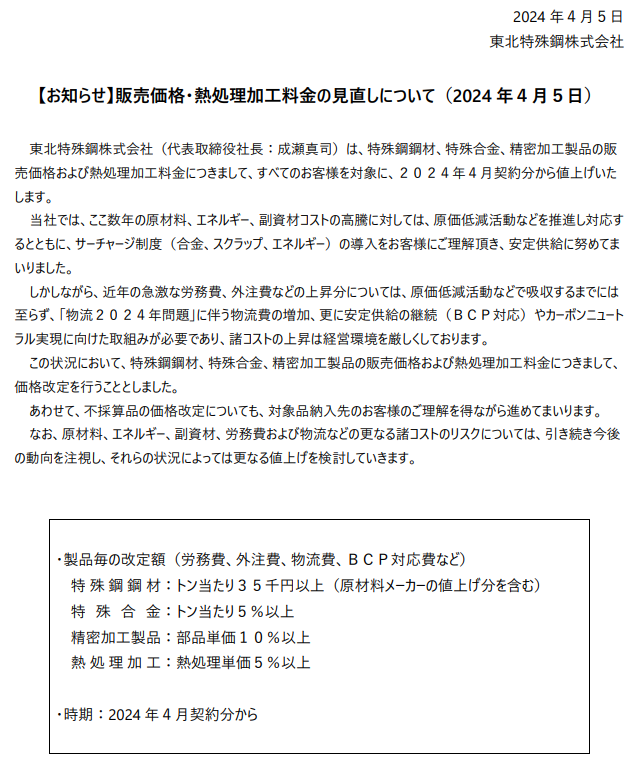 도호쿠특수강은 “최근 수년간 원재료, 에너지, 부자재 비용 부담에도 할증료 제도 도입과 원가 절감 노력으로 공급 안정에 주력해왔지만 물류 2024 문제 등 급격한 노무비 증가와 탄소 중립 비용 증가 등으로 부담이 증가하면서 가격 인상이 불가피해졌다”라고 설명했다. 또한 회사는 제품 원가 상승 위험이 지속될 수 있다며 상황에 따라 추가 인상 가능성도 있다고 밝혔다.