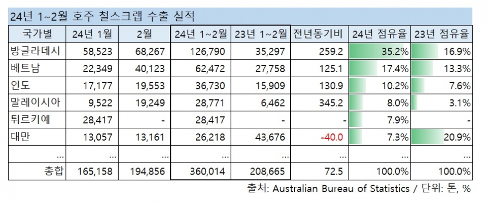 호주 무역통계에 따르면 올해 1~2월 호주 철스크랩 수출은 전년 동기 대비 72.5% 급증한 36만톤을 기록했다. 국가별 수출은 △방글라데시향 12.7만톤(+259.2%) △베트남향 6.2만톤(+125.1%) △인도향 3.7만톤(+130.9%) 등이다.