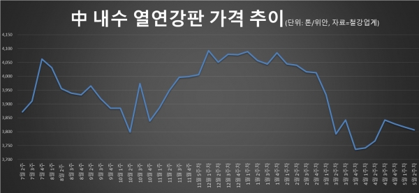 올해 중국 열연강판 가격은 3월 이후 약세를 거듭하고 있다. 지난 연말부터 가격 강세를 나타낸 중국 열연강판 가격은 올해 연초 기준 4,100위안에 근접한 가격을 나타냈다. 다만 3월 이후 중국 경기 부진이 이어지자 이에 따른 철강 수요 감소로 제품 가격은 약세로 돌아섰다.