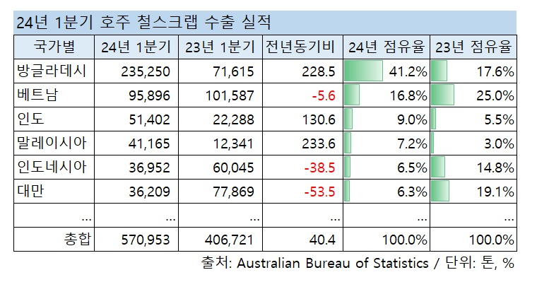 호주 무역통계에 따르면 올해 1분기(1~3월) 호주 철스크랩 수출은 57만톤으로 전년 동기 대비 40.4% 급증했다.