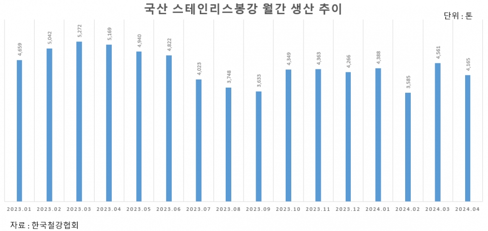 한국철강협회에 따르면 올해 1~4월 스테인리스강 봉강 생산량은 1만6,699톤을 기록했다. 전년 동기 대비 17.1% 급감했다. 특히 지난해 같은 기간에는 1월 4,659톤을 제외하고는 모두 월 5천 톤 이상을 생산했던 가운데 올해는 2월에 3,585톤을, 나머지 달에는 4천 톤 초·중반대 수준에 머물렀다.