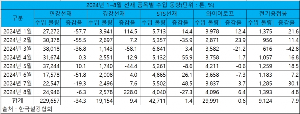 한국철강협회 데이터에 따르면 8월 누적 기준 연강선재 수입은 22만9,657톤으로 전년 동기 대비 34.3% 감소했으나, 경강선재와 STS선재, 와이어로프와 전기용접봉 수입은 각 1만9,154톤, 4만2,711톤, 2만9,991톤, 9,124톤으로 전년 동기 대비 9.4%, 1.4%, 0.6%, 7.9% 증가했다.