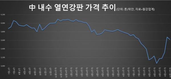 다만 중국 정부의 경기부양 추가 대책에 대한 의문과 구체적 규모, 세부적 내용이 공개되지 않아 관련 가격은 다시금 약세로 돌아섰으며 열연강판 가격도 3,700위안을 돌파하지 못했다. 이와 함께 부동산 시장의 침체가 여전하다는 평가도 나오며 시장 가격 상승에 제한을 걸었다.