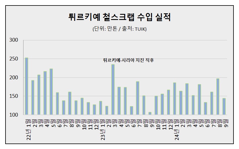 튀르키예 무역통계에 따르면 9월 튀르키예 철스크랩 수입은 144만3,000톤으로 전년 동월 대비 34.7% 급증했다. 두 달 연속 전년 대비 급증세다.