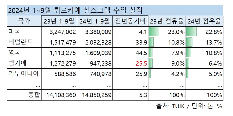 이에 따라 올 1~9월 튀르키예 철스크랩 수입은 1,485만톤으로 전년 동기 대비 5.3% 증가한 것으로 나타났다. 앞서 상반기(+3.6%) 대비 증가폭도 확대된 모습이다.