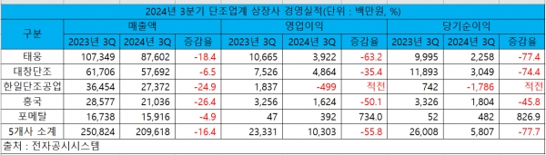 세계 조선업 경기 호조와 지정학적 갈등 심화에 따른 K-방산 수출 호조에도 내수 소비 부진에 따른 국내 자동차 생산 감소, 세계 건설 경기 장기 침체에 따른 건설 및 중장비 부문 수요 감소, 주요 선진국 및 중국의 경기 부진에 따른 산업기계와 플랜트, 로봇 부문의 수요가 모두 감소하면서 3분기 단조업계의 매출액이 감소했다. 그리고 소재 가격 하락에도 수요 감소와 제품 단가 하락으로 인해 영업이익과 당기순이익도 감소했다.