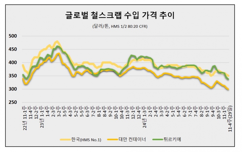 업계에 따르면 11월 넷째 주 대만 컨테이너 철스크랩 수입 가격은 미국산 HMS(80:20) 기준 톤당 300~302달러(이하 CFR)로 전주 대비 5달러 하락했다. 6주 연속 하락에 낙폭은 총 30달러로 늘면서 4년 만에 최저 수준이다.