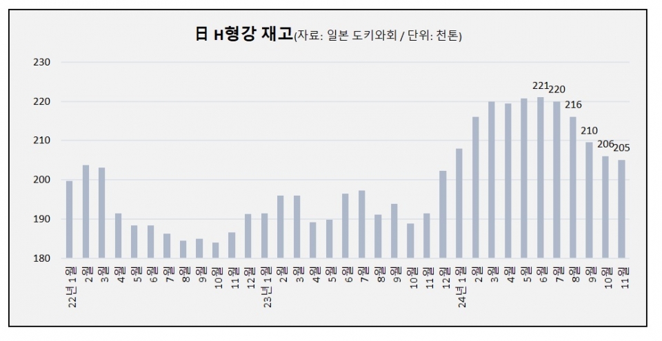 일본제철 H형강 유통업체 모임 도키와회(ときわ会)에 따르면 11월 말 전국 유통재고는 20만5,400톤으로 전월 대비 0.4%(800톤) 줄면서 지난 6월(22만900톤) 이후 5개월 연속 감소세다.