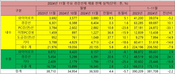 11월 품목별 내수 판매 동향을 살펴보면 와이어로프와 경강선, 도금강(연)선 판매는 각 3,880톤, 6,404톤, 1,048톤으로 전년 동월 대비 5.1%, 1.6%, 10.1% 증가한 반면 PC강(연)선과 이형PC강봉, 기타제품 판매는 판매는 각 2,882톤, 1,227톤, 4,713톤으로 전년 동월 대비 23.8%, 15.9%, 18.6% 감소했다.