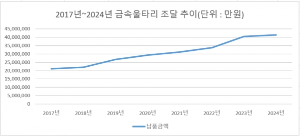 조달데이터허브에 따르면 국내 금속울타리 관급시장은 2017년 2,115억1,268만 원을 기록했고, 이후 지속적으로 확대되어 지난해에는 4,143억4,393만 원까지 확대됐다.