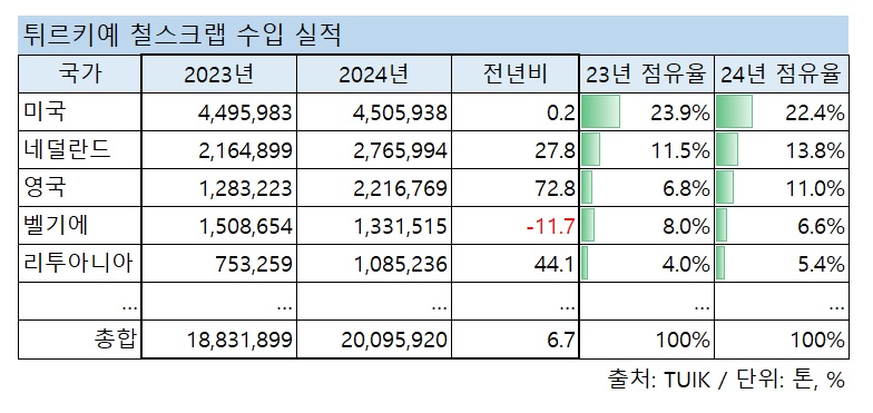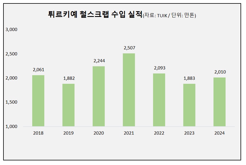 지난해 철스크랩 수입 증가는 조강 생산 증가에서 기인한 모양새다. 지난해 튀르키예 조강 생산량은 전년 대비 9.4% 증가한 3,689만톤으로 집계됐다.