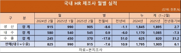 2월 누계 기준 생산은 189만5천 톤으로 전년 동기 대비 2.7% 늘었다. 반면 내수 판매는 108만5천 톤을 기록해 지난해 같은 기간과 비교해 7.3% 감소했다. 수출은 82만 톤으로 전년 대비 31.2% 늘었다.