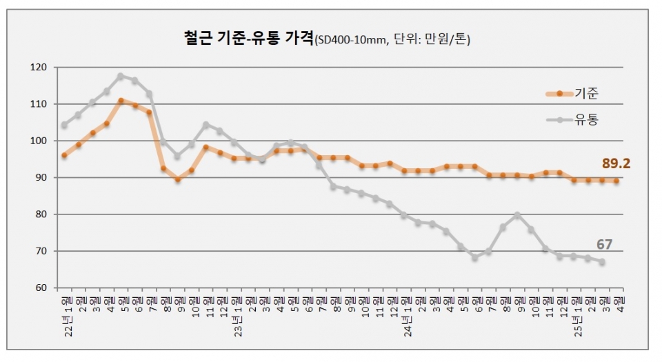 다만 철근 기준가격은 여전히 90만원 선에 육박하고 있으나 유통시세는 2023년부터 기준가격을 한참 밑돌면서 시장에 미칠 영향은 제한적인 상황이다.