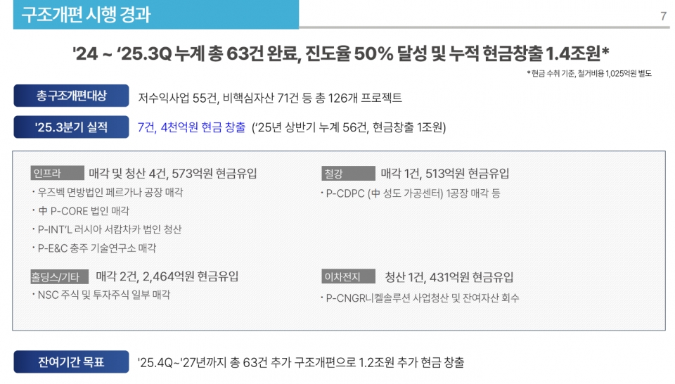 특히 3분기에는 7건, 4천억 원의 구조조정이 성공했다. 3분기에는 철강 부문에서 P-CDPC(중국 성도 가공센터) 1공장 매각으로 513억 원이 확보됐고, 홀딩스 및 기타 부문에선 일본제철(NSC) 주식 및 투자주식 식 일부 매각으로 2,464억 원을 확보했다. 이차전지 부문에선 P-CNGR 니켈솔루션 사업청산과 잔여 자산 회수로 431억 원의 현금이 확보됐고, 인프라 부문에선 중국 P-CORE 법인 매각과 러시앙 P-INT`L 서캄차카 법인 청산, 우즈베키스탄 면방법인 페르가나 공장 매각, 국내 충주 P-E&C 기술연구소 매각 등으로 537억 원을 확보했다.