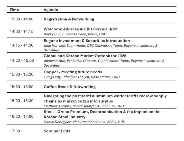 CRU는 "미국의 관세 압박이 고조되면서 글로벌 경제의 회복력이 시험대에 오르고 있고, 중국에서는 수요 진작을 위한 정부의 지속적인 지원이 필수적이지만 산업 전반의 과잉 생산과 부진한 부동산 시장이 투자를 제약할 가능성이 크다"면서 "정책 리스크가 이어지고 세계 수요의 양대 축이 흔들리는 상황에서 2026년 원자재 시장을 형성할 거시경제 및 지정학적 요인을 면밀히 살펴보는 것이 그 어느 때보다 중요하다. 이번 세미나를 통해 핵심적인 시장 기반 요소에 대해 깊이 있고 시의적절한 인사이트를 제공할 예정이다"고 밝혔다.