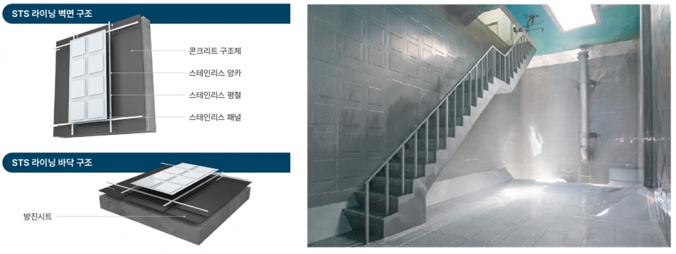 이러한 STS 패널을 물저장 시설(콘크리트 저수조)에 부착 또는 설치 적용하는 것을 ‘라이닝 (공법)’이라고 부른다. 라이닝은 직접적으로는 콘크리트 벽체에 판을 용접하여 별도 방수 처리가 필요 없는 벽체를 만드는 공법을 뜻하는 것으로, STS 라이닝은 내식성과 내구성, 내열성 등이 우수하고 깨끗하고 안전한 수질을 책임질 수 있는 스테인리스를 적용한다는 특징을 갖고 있다.