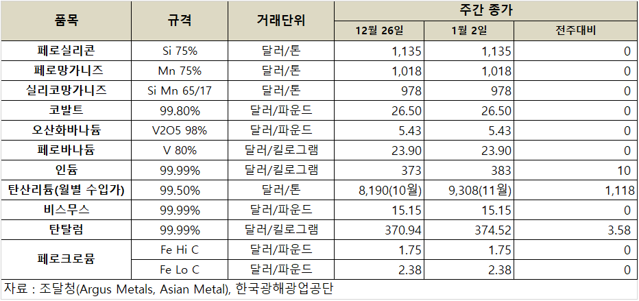 [표] 희유금속 가격 동향(1월 2일)