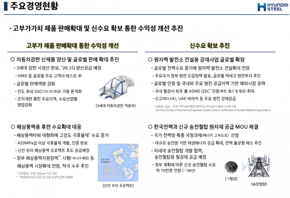 아울러 현대제철은 국내외 고부가가치 제품 포트폴리오 다변화에도 박차를 가하고 있다. 회사는 차세대 자동차 소재인 '3세대 강판' 시생산을 완료하고, 2026년 1분기 양산 공급을 앞두고 있다. 현재 글로벌 완성차사를 대상으로 테스트를 진행 중이며, 인도 푸네 SSC 가동을 통해 글로벌 판매 역량을 강화한다는 계획이다.