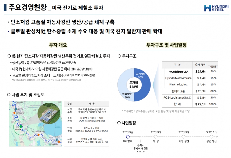 회사는 미국 루이지애나주 어센션 패리시에 총 58억 달러(약 7조 7천억 원)를 투입해 탄소저감 자동차강판 생산에 특화된 전기로 일관제철소를 건설한다. 이번 투자는 현대차그룹(80%)과 포스코(20%)의 합작 형태로 진행되며, 오는 2026년 3분기 착공해 2029년 1분기 상업 생산을 목표로 하고 있다.