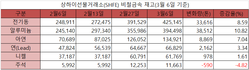 김영은 기자 yekim@snmnews.com 다른 기사 보기 관련기사 [표] 상하이선물거래소 재고(2월 27일) [표] 상하이선물거래소 재고(2월 13일) [일일비철시황] 춘절 앞두고 거래 위축…알루미늄 관세 이슈·재고 증가에 전반적 약세 저작권자 © 철강금속신문 무단전재 및 재배포 금지