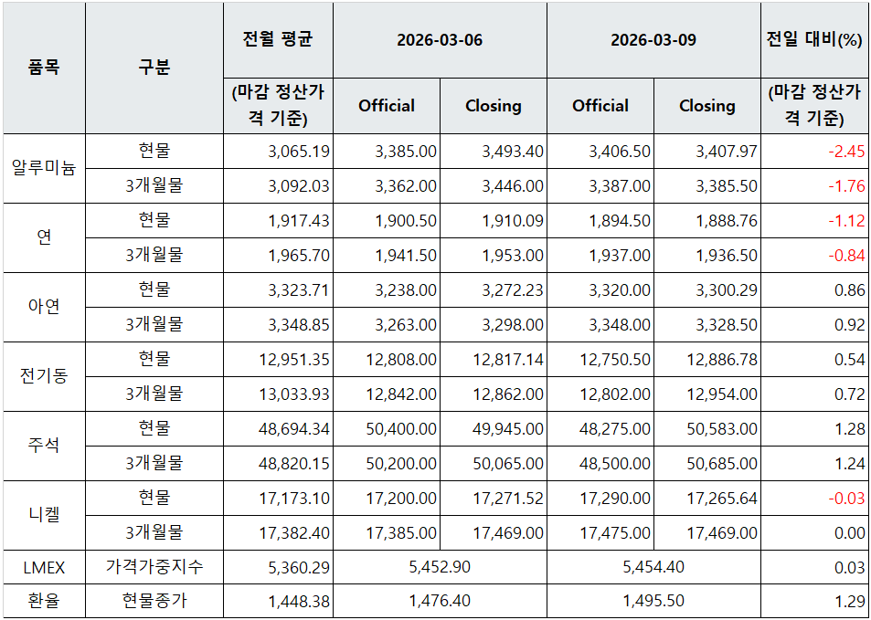[표] LME 비철금속 및 환율 동향(3월 9일)