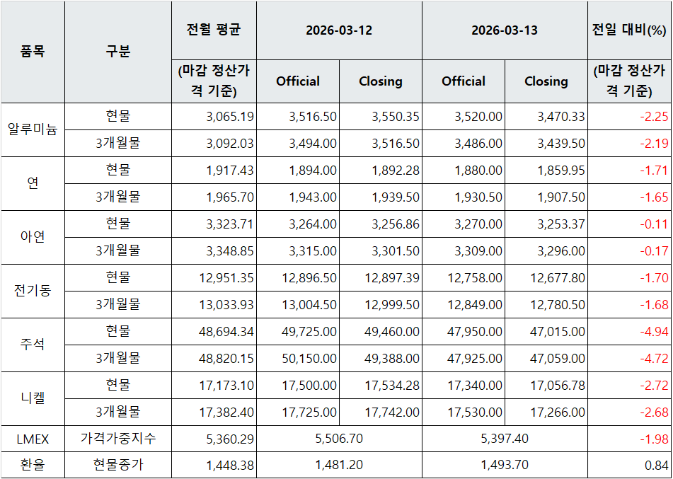 [표] LME 비철금속 및 환율 동향(3월 13일)