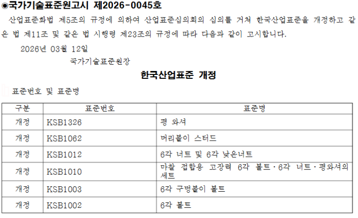 국표원은 KS B 1325(평 와셔), KS B 1062(머리붙이 스터드), KS B 1012(6각 너트 및 6각 낮은너트), KS B 1010(마찰 접합용 고장력 6각 볼트·6각 너트·평와셔의 세트), KS B 1003(6각 구멍붙이 볼트), KS B 1002(6각 볼트) 등의 KS 규정을 개정 완료했다고 밝혔다.