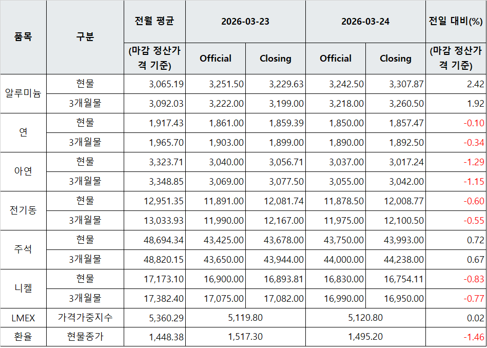 [표] LME 비철금속 및 환율 동향(3월 24일)