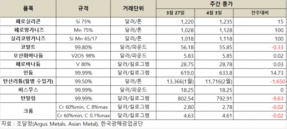 [표] 희유금속 가격 동향(4월 3일)