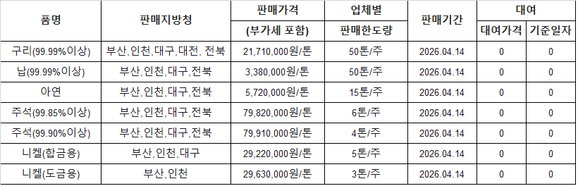 [표] 조달청 방출 가격(4월 14일)