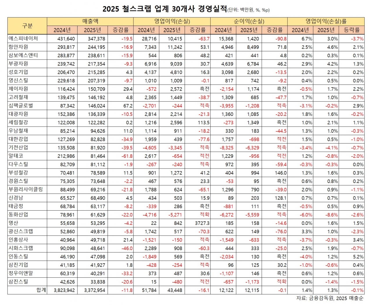 20일 본지가 국내 주요 철스크랩 공급사 30곳의 경영실적을 집계한 결과, 지난해 이들 매출액은 총 3조3,730억원으로 전년 대비 11.8% 감소한 것으로 나타났다. 이 기간 영업이익도 16.1% 줄어든 434억원을 기록하면서 영업이익률은 0.1% 포인트(p) 하락한 1.3%에 머물렀다.
