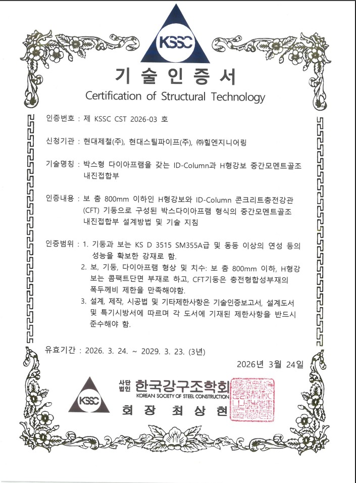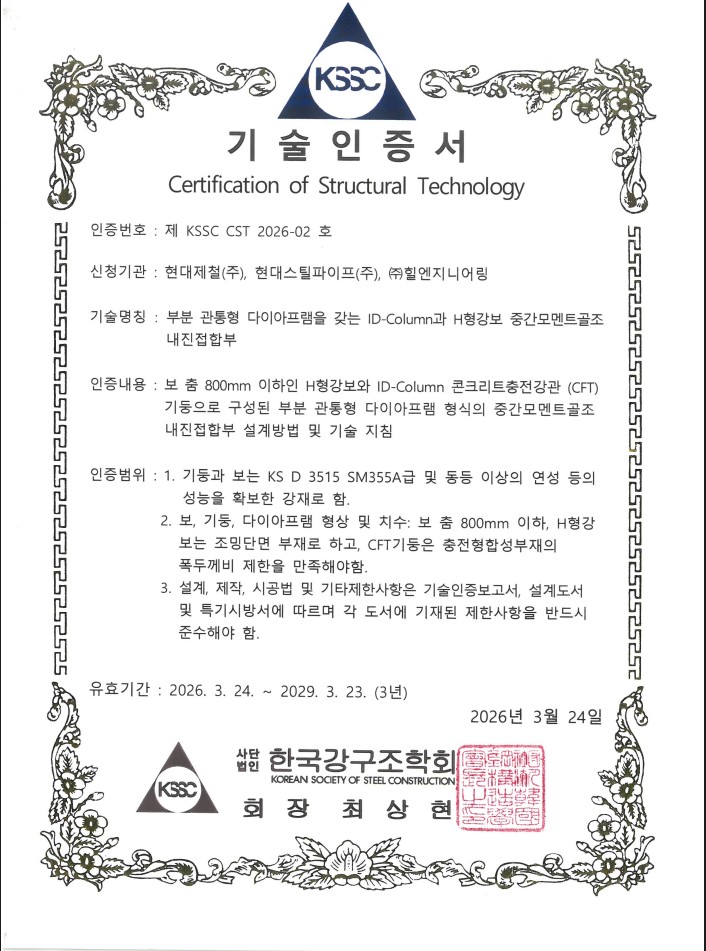 현대제철, 현대스틸파이프, 힐엔지니어링이 공동으로 연구개발한 원형 원형 CFT기둥 합성구조공법인 ‘ID-Column’과 H형강보를 연결하는 내진접합부 기술이 한국강구조학회(KSSC)로부터 구조 안정성 및 기술 신뢰성을 공식 인증받았다.