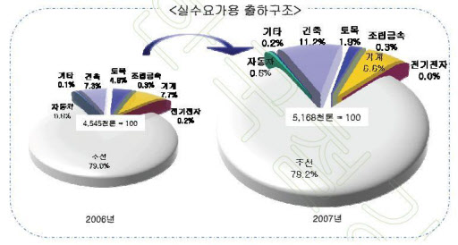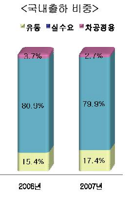 차공정용으로는 가장 적은 양인 17만7,000톤이 출하됐으며 유통판매용으로는 112만7,000톤으로 지난해 대비 30만톤 정도가 더 많이 출하됐다. 유통향 비중은 ’03년 이후 축소되었으나 ’07년 증가세로 반전했다. 협회는 중소 조선업체들의 수요 확대 및 신증설 설비의 정상가동과 생산 증가에 따라 유통물량이 증가한 것으로 분석했다.