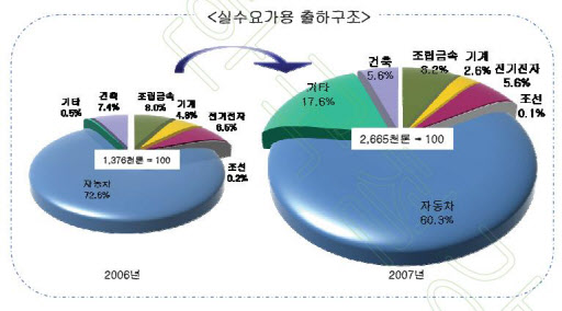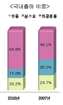 국내 출하비중을 살펴보면 우선 실수요가용 비중이 2006년 15%에서 2007년 26%로 크게 늘어난 반면 차공정용 비중이 64.8%에서 49.2%로 크게 줄어들었다.