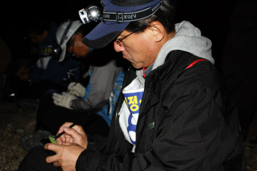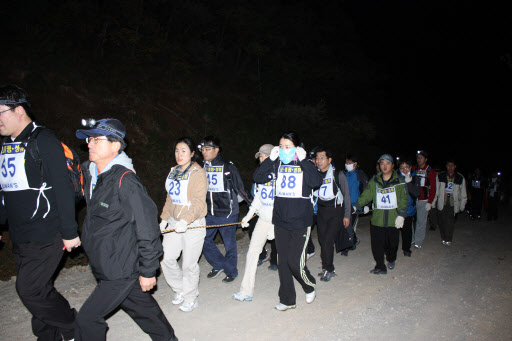 ▲사진 설명 : 한마음 줄을 잡고 20명이 한조가 되어 서로 서로를 이끌며 행군하는 모습