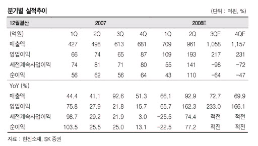 현진소재의 4 분기 예상매출액은 1,157억원, 영업이익은 231억원이며 풍부한 수주잔고를 바탕으로 2009년 매출액은 4,402억원, 영업이익 788억원 달성은 무난할 것으로 전망했다.