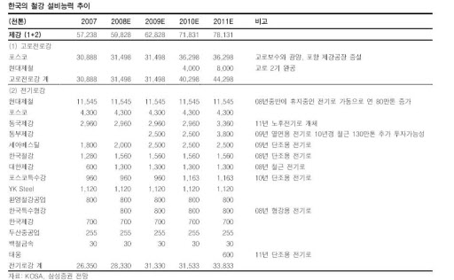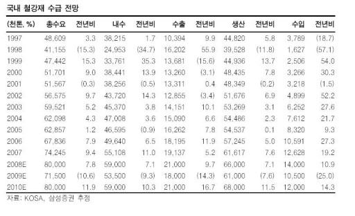 삼성증권 2009년 철강전망에 따르면 2009년에 철강내수는 국내 경기침체로 9% 감소하고, 수출도 선진국 및 이머징마켓의 어려움, 세계 09년은 국내 철강산업에게 철강가격하락과 국내외 수요감소로 어려운 해가 될 것으로 보인다. 각국의 보호무역주의 경향 등으로 14% 감소할 것으로 보인다. 이러한 수준은 2007년의 수준으로 후퇴한 것이다. 이에 따라 국내 생산은 7.6% 감소하고 수입도 수요감소와 금융권의 LC발행어려움으로 25% 감소할 것으로 보인다. 한편, 10년에는 내수 및 수출 모두 국내외 경기회복으로 10%와 17% 늘어날 것으로 보이고 생산도 포스코 설비 보수와 현대제철의 고로건설에 따른 생산능력 증가로 11.5% 늘어날 것으로 보인다. 또한, 10년부터의 경기회복이 설비증설을 다소 흡수할 수 있어 다행으로 보인다.