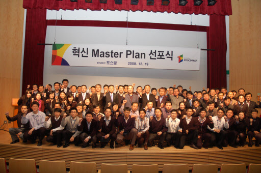 이날 행사는 지난 9월부터 9주간에 걸쳐 진행해 온 포스코 맞춤식 혁신컨설팅과 워크아웃 미팅을 통해 기업문화를 바꾸기 위한 진단으로 혁신 Master Plan을 수립했으며 그 실천의지를 다지고자 선포식을 가졌다.